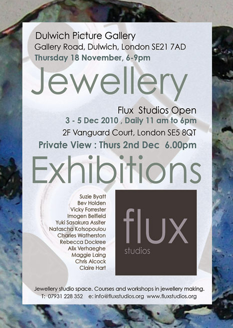 Newsletter No. 7 from Flux Studios. Feels like winter**......must be time for mulled wine and shiny things! We're pleased to invite you to view the latest collections fine of jewellery by those rare talents at Flux Studios. Come to see us; meet our new members and discover what inspires their work. We have 2 dates for your diary Thursday 18 November at the Dulwich Picture Gallery (one night only) Thursday 2 December - at Flux Studios (to 5 December) - Vanguard Court opens it's gates to you